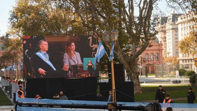 Macri llegó una hora tarde al chocolate de Casa Rosada y apenas en tiempo para el inicio del Tedeum que estuvo vedado a la prensa y por el que el gobierno pagó casi un millón de pesos para reproducir a través de una pantalla gigante ubicada en la plaza en la que siquiera estuvieron presentes las habituales palomas.