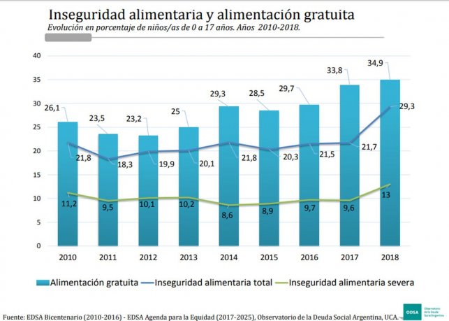 El aumento de la pobreza se equipara con la mala alimentación. Así en 2018 un 29,3% sufrió algún déficit de alimentación mostrando una fuerte suba de la medición anterior donde se ubicaba en 21,7%. En tanto, un 13% registró el nivel más elevado de carencia, es decir pasaron hambre. Además se detectó que de ese universo de niños un 35% asiste a comedores escolares.