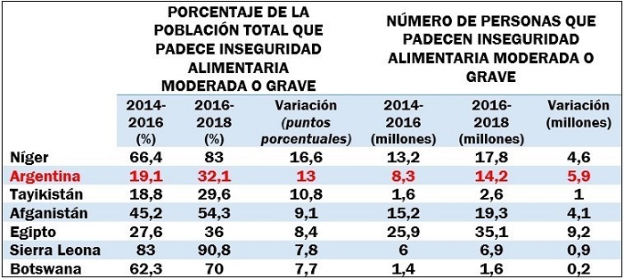 El informe “El estado de la seguridad alimentaria y la nutrición en el mundo 2019”, elaborado en forma conjunta por FAO, FIDA, UNICEF, PMA y OMS, señala que el número de personas que padecen inseguridad alimentaria moderada o grave en nuestro país pasó de 8,3 millones en el período 2014-2016 a 14,2 millones entre los años 2016 y 2018.Esto representa un aumento nada menos que del 71% en la cantidad de individuos con falta de acceso continuado a los alimentos, uno de los incrementos más altos registrados a nivel mundial junto con Níger, Tayikistán, Afganistán, Egipto, Sierra Leona y Botswana.
