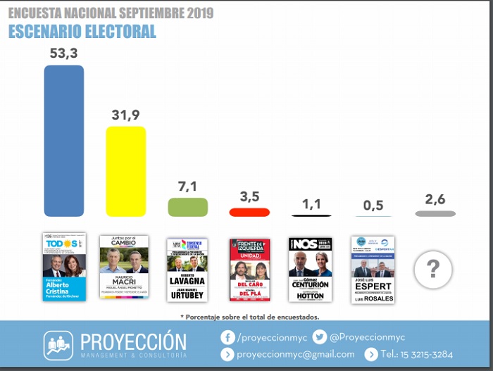 “El escenario electoral, en la boleta presidencia, Alberto suma un 53% y Macri un 31. Lavagna llega al 7, Del Caño al 3,5 y Espert al 0,5”.