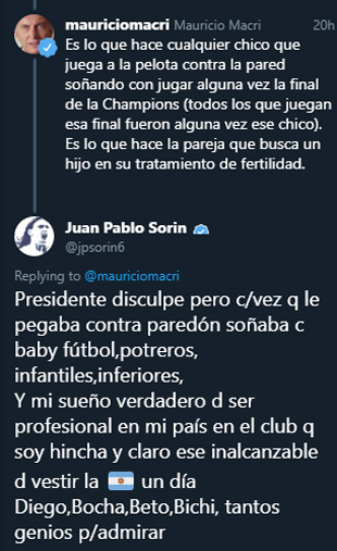 El ex jugador de la Selección nacional, Juan Pablo Sorín, le respondió a Macri y aseguró que “mi sueño verdadero de ser profesional en mi país en el club que soy hincha y de vestir” la camiseta de Argentina un día.