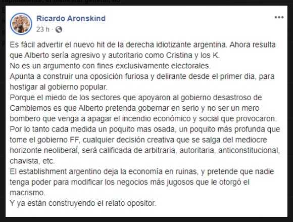 "Los argentinos tropezamos tres veces con este sistema perverso: bajo la última dictadura, en la década Menem-De la Rúa y ahora con el macrismo. El resultado fue siempre el mismo: las tres veces terminamos más endeudados, más empobrecidos y más desiguales. Neoliberalismo y «populismo» -para sintetizar y usar una expresión comprensible- no son términos equivalentes en su antagonismo. La experiencia nos indica de sobra que construir, en términos socioeconómicos, cuesta mucho más que destruir. La barbarie puede imponerse muy rápidamente; el bienestar general, no".