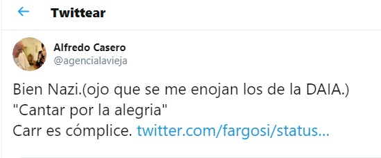 El actor cómico escribió: "Bien Nazi.(ojo que se me enojan los de la DAIA.) "Cantar por la alegria" Carr es cómplice". La referencia a la DAIA no es casual, días atrás, la entidad judía DAIA, acusó a Laura Alonso de banalizar el holocausto.
