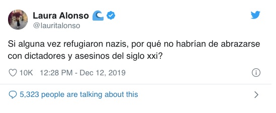 La ex titular de la Oficina Anticorrupción comparó el asilo político otorgado a Evo Morales con la llegada de nazis a la Argentina. "Si alguna vez refugiaron nazis, por qué no habrían de abrazarse con dictadores y asesinos del siglo xxi?", tuiteó la ex funcionaria macrista. La DAIA, por su parte, tuiteó lo siguiente: "Banalizar la Shoá, tildando de dictadores y asesinos a dirigentes políticos colisiona contra todo escenario de convivencia. Durante la Shoá se asesinaron a 6 millones de judíos, evitemos las comparaciones incomparables".