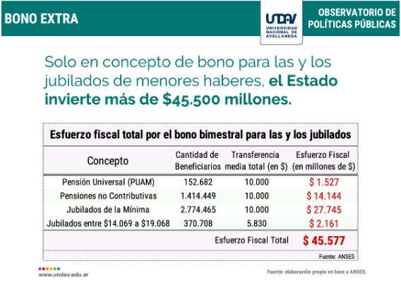 El Observatorio de Políticas Públicas de la Universidad Nacional de Avellaneda (UNDAV) reveló que, la inversión del Estado en los bonos extra a jubilados asciende a los 45.577 millones de pesos y alcanza a más de 4,7 millones de beneficiarios.