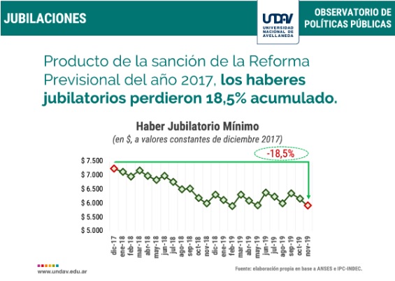 El informe elaborado por el equipo de economistas de Economía en UNDAV, advierte que los haberes jubilatorios vienen de perder un 18,5% acumulado desde que se aprobó la Reforma Previsional en el año 2017.