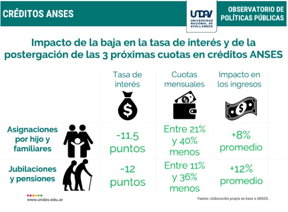Esta baja logra que las cuotas se reduzcan entre 21% y 40% para los beneficiarios de AUH y entre 11% y 36% para los jubilados; lo que genera un aumento en el ingreso de 8% promedio para las asignaciones y 12% promedio para jubilaciones.