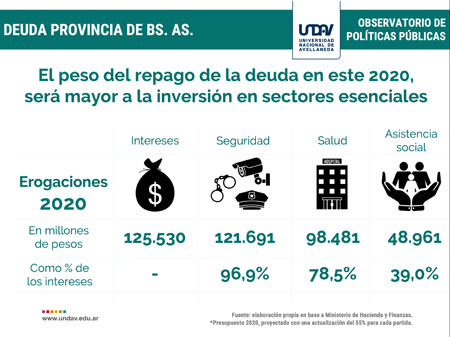 Si comparamos el costo de los intereses de la deuda que se generó en los últimos 4 años con lo que la provincia invierte en sectores esenciales, se tiene que el pago de la deuda en este 2020 deberá ser aproximadamente igual a la inversión en Seguridad, ampliamente superior al costo de Salud, y casi tres veces más que el costo de Asistencia Social, según nuestras hipótesis de gasto para el año en curso.