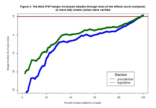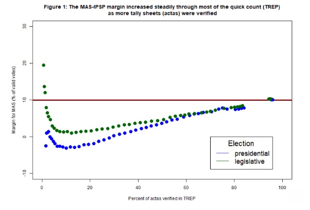 En el cómputo final, el margen de ventaja de Morales se elevó a 10.56 puntos porcentuales sobre el candidato Mesa de la alianza CC. Para declarar la victoria, las elecciones presidenciales bolivianas requieren que un candidato tenga una ventaja de 10 puntos porcentuales sobre el segundo candidato más votado. El cambio en el margen de ventaja a favor de Morales luego de que la TREP se detuviera fue señalado por la OEA como sorprendente. Asimismo, la OEA declaró que le generaba una “profunda preocupación”, creando así la impresión de la probabilidad de un fraude electoral a favor del MAS-IPSP.