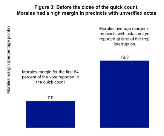 Cuando la TREP se detuvo, los recintos que tenían actas que faltaban contabilizar ya favorecían considerablemente a Morales. El gráfico 3 muestra que, en promedio, los recintos con actas que faltaban ser computadas votaron a favor de Morales por un margen de 19.8 puntos porcentuales antes de la detención de la TREP.