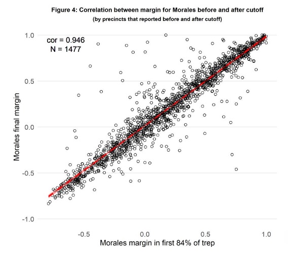Teniendo en cuenta la fuerte relación entre los márgenes de ventaja de los recintos electorales, estimamos el margen de voto verificado después de la detención de la TREP basándonos en las actas contabilizadas antes de la detención de la TREP de los mismos recintos. Estimamos que el margen de ventaja de Morales en el 13.78% de los votos de esas actas es de 19.12 puntos porcentuales. Por lo tanto, podemos atribuir con seguridad un aumento en el margen de Morales de 1.59 puntos porcentuales, pasando de 7.87 con 84% de los votos finales contabilizados a 9.46 puntos porcentuales con un 97.78% de los votos contabilizados.(2)