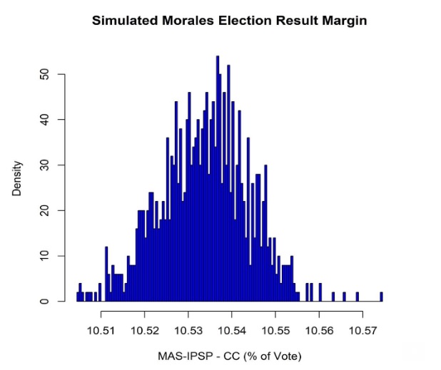 En el gráfico a continuación, simulamos el margen de voto final para Morales, dadas las tendencias de voto que ocurrieron antes de que se detuviera el recuento de votos. Realizamos 1000 simulaciones sobre cuál podría ser el margen de voto entre Morales y la alianza CC, dadas las tendencias de votación que ocurrieron en las mismas localidades y municipios así como en los recintos con actas todavía sin contabilizar. Encontramos que Morales podría esperar al menos una ventaja de 10.5 puntos porcentuales sobre la alianza CC, y en promedio una ventaja de más de 10.3 puntos porcentuales sobre el CC. Por lo tanto, los resultados sugieren que la victoria de Morales puede explicarse por su desempeño electoral antes de que se detuviera el recuento rápido de votos.
