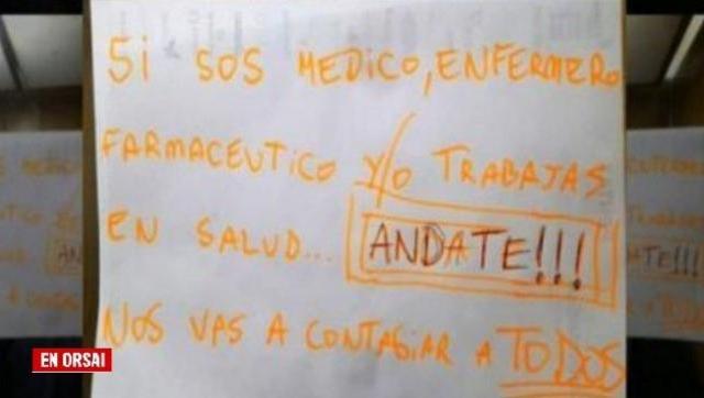 ESTO OCURRIÓ EN UN COMPLEJO DE VIVIENDAS EN VENADO TUERTO, SANTA FÉ, DONDE LOS VECINOS DEJARON UN CARTEL POR DEMÁS DISCRIMINATORIO CON UNA FRASE DEMASIADO FUERTE: “SI SOS MÉDICO ANDATE, NOS VAS A CONTAGIAR”, DICE EL MENSAJE QUE POR SUPUESTO, COMENZÓ A RECORRER LA WEB Y SE VOLVIÓ VIRAL.