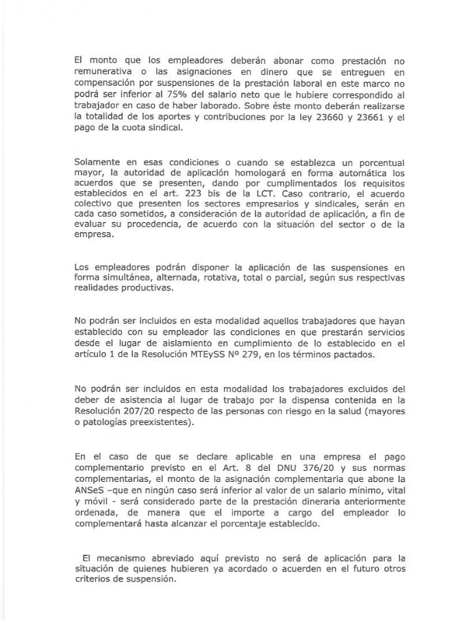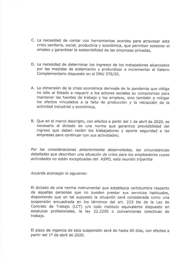 Según explica el documento los representantes de los industriales y de los trabajadores intentaron buscar “una norma instrumental que establezca certidumbre respecto de aquellas personas que no pueden prestar sus servicios habituales, disponiendo que en tal supuesto la situación será considerada como una suspensión encuadrada en los términos del art. 223 bis de la Ley de Contrato de Trabajo”.