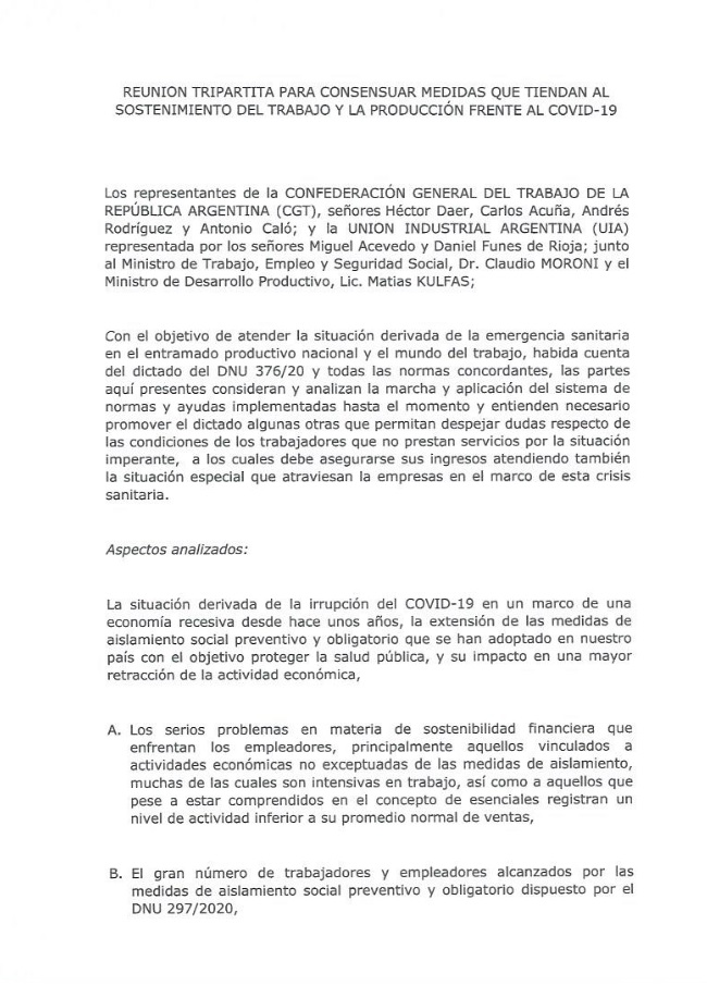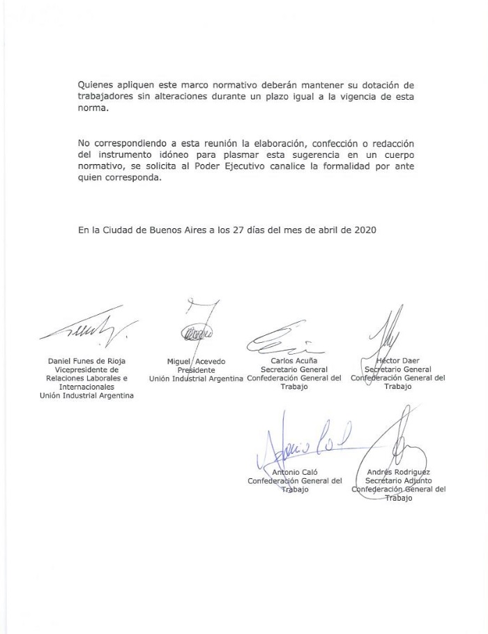 (Por Walter Onorato) El documento cuenta con las rúbricas de Daniel Funes de Rioja, Vicepresidente de Relaciones Laborales e Internacionales de la UIA; Miguel Acevedo, Presidente de la UIA; Carlos Acuña, Secretario General de la CGT; Héctor Daer, Secretario General de la CGT; Antonio Caló y Andrés Rodríguez, Secretario Adjunto de la CGT