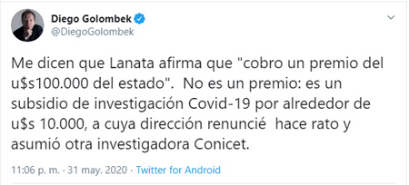 Una de los dardos a la generación de odio fue desmentido de inmediato por el principal afectado por la noticia falsa. Se trató de un nuevo ataque a los científicos del CONICET, en este caso personificado en el investigador Diego Golombek.