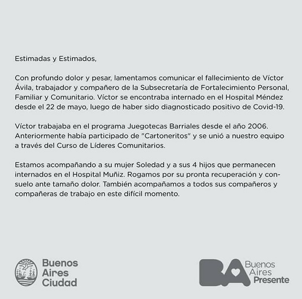 En el día de ayer falleció el primer trabajador, el Sr. Víctor Ávila, quien trabajaba en el Programa Juegotecas Barriales desde el 2006.