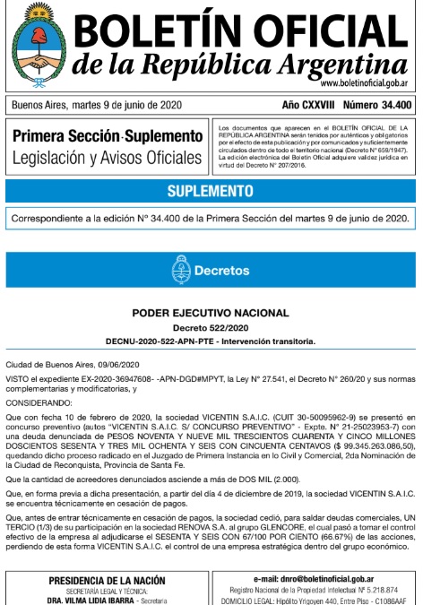 Los argumentos del Gobierno Nacional publicados en el Boletín Oficial de acuerdo al Decreto de Necesidad y Urgencia (DNU) 522/2020 sobre la intervención de Vicentín.