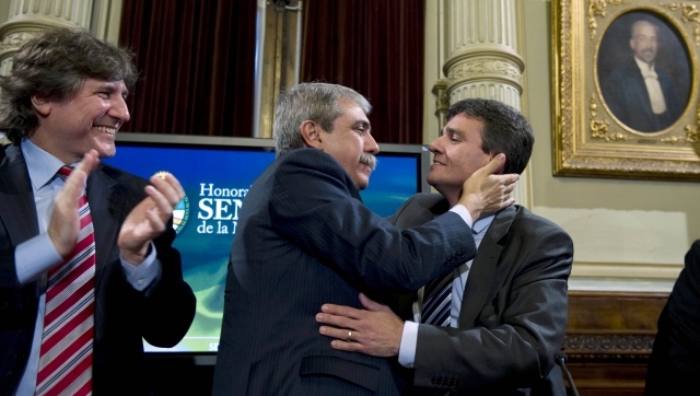 Juan Zabaleta se saluda con Aníbal Fernández ante la mirada del Presidente del Senado, Amado Boudou