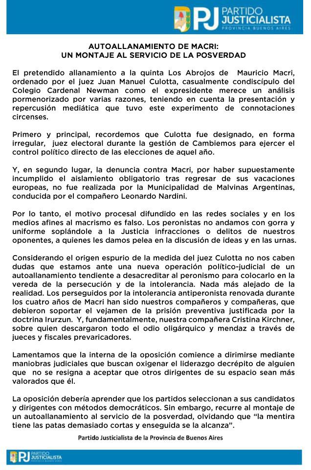 En un documento titulado "Autoallanamiento de Macri: un montaje al servicio de la posverdad", el PJ bonaerense afirmó que el juez Juan Manuel Culotta, quien ordenó el allanamiento "es casualmente condiscípulo del colegio Cardenal Newman" del expresidente.