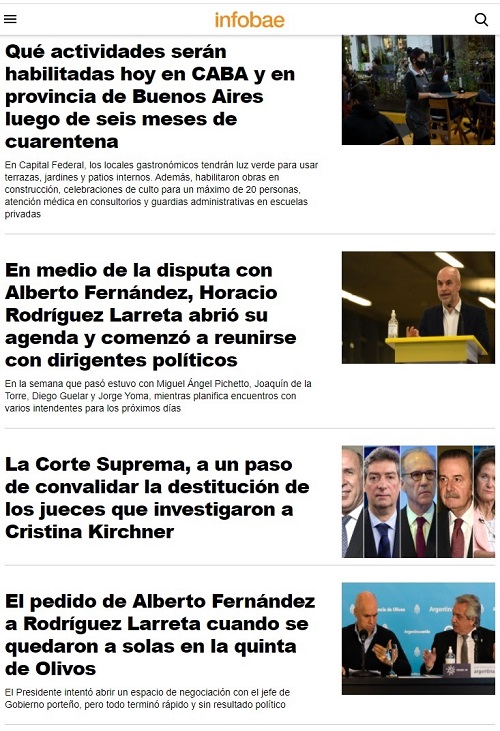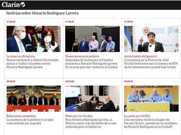El ejemplo más paradigmático es el de InfoBae que publicó justamente en el día de ayer que “Después de seis meses de pandemia y cuarentena, y con el coronavirus como tema central de los argentinos, el jefe de Gobierno de la Ciudad de Buenos Aires, Horacio Rodríguez Larreta, se convirtió en el dirigente político con mejor imagen del país.” Sin ningún tipo de pudor en el día que reprimen a bastonazos a los que nos cuidan en los hospitales públicos, Infobae ensalza la imagen de Larreta instalando en la mente de los lectores desprevenidos que es el político con mejor imágen positiva. Saque sus propias conclusiones.