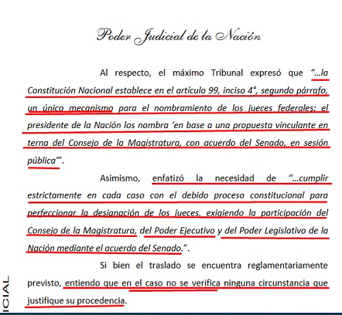 Y quiero ser clara en esto, los jueces podrían perfectamente haber concurrido a la audiencia Publica del Senado a los fines de subsanar el problema de sus traslados mediante la obtención del acuerdo correspondiente. Pero decidieron NO concurrir...