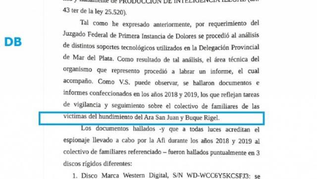 En la presentación judicial, la funcionaria reveló que "se hallaron documentos e informes confeccionados entre 2018 y 2019 que reflejan las tareas de vigilancia y seguimiento sobre el colectivo de los familiares de las víctimas del ARA San Juan y el buque Rigel".
