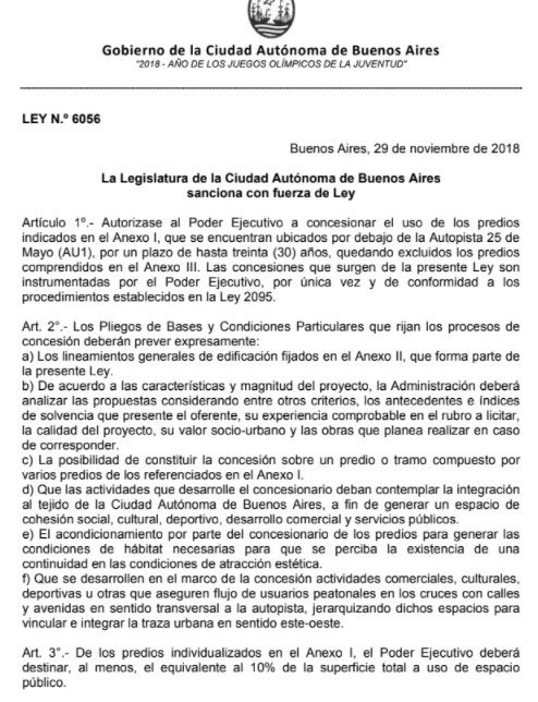 Debemos recordar que esta ley fue tratada y aprobada en la Legislatura porteña con los votos del oficialismo de Juntos por el Cambio y del bloque Evolución. Esta iniciativa propuesta por Horacio Rodriguez Larreta tiene la finalidad de conceder más de 100 predios ubicados debajo de la Autopista 25 de Mayo y en su mayoría son depósitos, estacionamientos y predios abandonados.