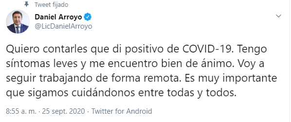 Luego de padecer algunos síntomas leves, el Ministro se realizó los estudios correspondientes y fue confirmado con la enfermedad que aqueja a todo el mundo.