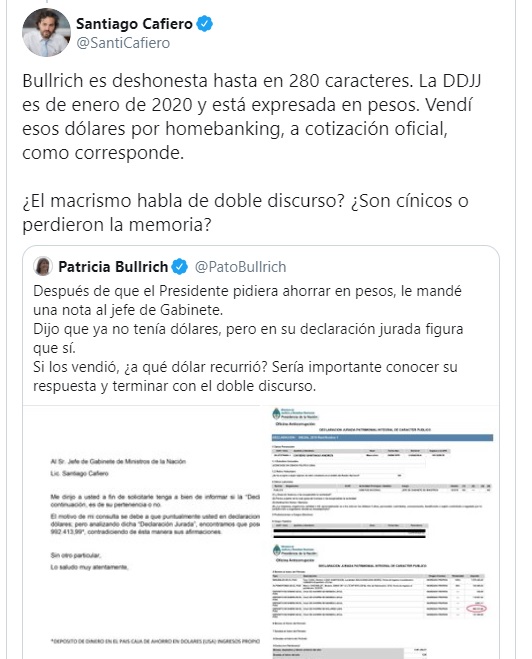 Luego, dejó en claro que ya no tiene dólares y que la titular PRO debería saberlo, y precisó que la transacción de las divisas que tenía fue mediante los mecanismos normativos vigentes: "Bullrich es deshonesta hasta en 280 caracteres. La DDJJ es de enero de 2020 y está expresada en pesos. Vendí esos dólares por homebanking, a cotización oficial, como corresponde".
