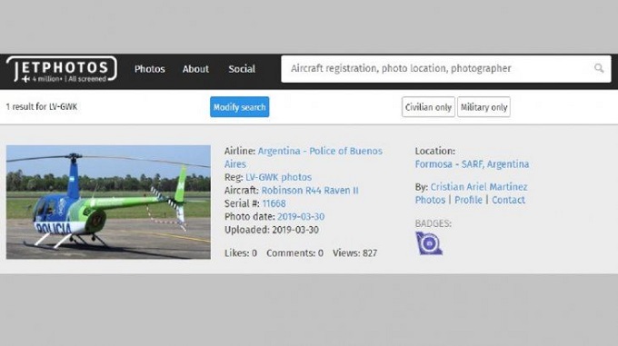 Se trata de un helicóptero Robinson R-44 matrícula LV-GWK perteneciente a la firma Beech Flying, de Leonardo Spokojny, una persona de máxima confianza del ex presidente Mauricio Macri, al punto tal que estuvo a cargo de los traslados aéreos del entonces candidato de Cambiemos en 2015.