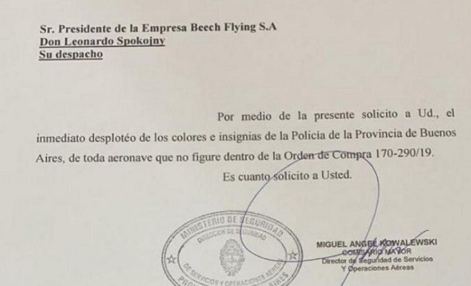 A partir de allí, las versiones son cruzadas, y tienen una gran contradicción: desde la gestión de Vidal sostienen que en junio de 2019 habían pedido el desploteo de la aeronave, y acompañaron la afirmación con un documento donde el comisario mayor Miguel Ángel Kowalewski le pide a la compañía: "El inmediato desploteo de los colores e insignias de la Policía de la Provincia de Buenos Aires de toda aeronave que no figure dentro de la Orden de Compra 170-290/19".