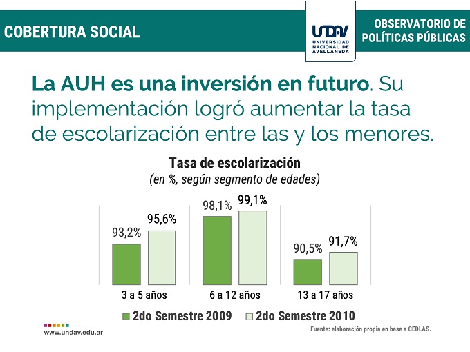 La implementación de la Asignación Universal por Hijo/a para Protección Social como un programa de asistencia condicionada a la escolaridad y la salud generó un sinfín de investigaciones respecto a los impactos que generaría sobre estas cuestiones. Dentro de los análisis más interesantes, cabe destacar el de Paz y Golovanesky (2014), donde en base a datos de EPH entre 2009 y 2010 evalúan el efecto de la AUH sobre la escolaridad de niños, niñas y adolescentes de 6 a 17 años. Las conclusiones de dicho trabajo de investigación, derivan en que la tasa de asistencia escolar de niños entre 5 y 12 años aumentó de 1 a 3 puntos porcentuales en los hogares elegibles del programa, mientras que los adolescentes de 13 a 17 años registraron un incremento de la tasa de escolarización de 5 a 7 p.p. En el mismo sentido, trabajos como Bustos y Villafañe, 2011; y Salvia et al, 2013; concluyeron en un impacto positivo sobre la escolarización en el nivel secundario, en las poblaciones participantes de la AUH. Según los datos del CEDLAS, al año de aplicación de la AUH los niños entre 3 y 5 años aumentaron 2 p.p. su tasa de escolarización, de 6 a 12 años 1p.p. y de 13 a 17 años 1,2 p.p.