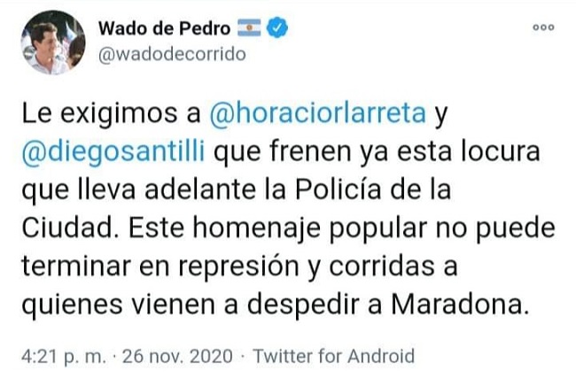 Tras la represión a los fanáticos del 10, el ministro del Interior, Wado de Pedro, expresó en su cuenta de Twitter: “Le exigimos a @horaciorlarreta y @diegosantilli que frenen ya esta locura que lleva adelante la Policía de la Ciudad. Este homenaje popular no puede terminar en represión y corridas a quienes vienen a despedir a Maradona.”