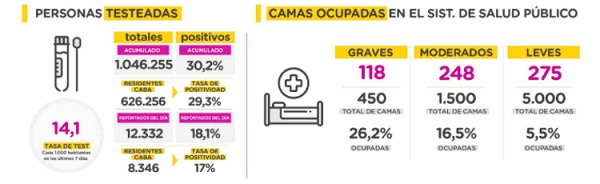 Mientras que en todo el país fueron confirmados 13.441 nuevos casos de COVID-19. Con estos registros, suman 1.676.171 positivos en el país, de los cuales 1.474.048 son pacientes recuperados y 158.147 son casos confirmados activos. En las últimas 24 horas, se notificaron 191 nuevas muertes, son 102 hombres y 89 mujeres. Al momento la cantidad de personas fallecidas es 43.976..