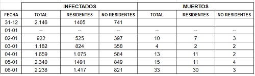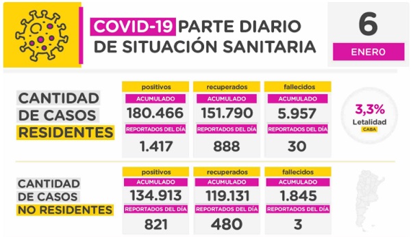 (Por Walter Onorato - @walteronorato) En el día de ayer, miércoles 6 de enero, se registraron 2.238 casos de infectados por Coronavirus en la ciudad de Buenos Aires. De los cuales 1.417 corresponden a vecinos residentes y 821 a no residentes. Cabe remarcar que fallecieron 33 personas por esta enfermedad (30 residentes y 3 no residentes). Un dato importante para observar el aumento de la curva de fallecidos. En lo que va del mes de enero entre residentes y no residentes fallecieron en la ciudad 75 personas por Covid.