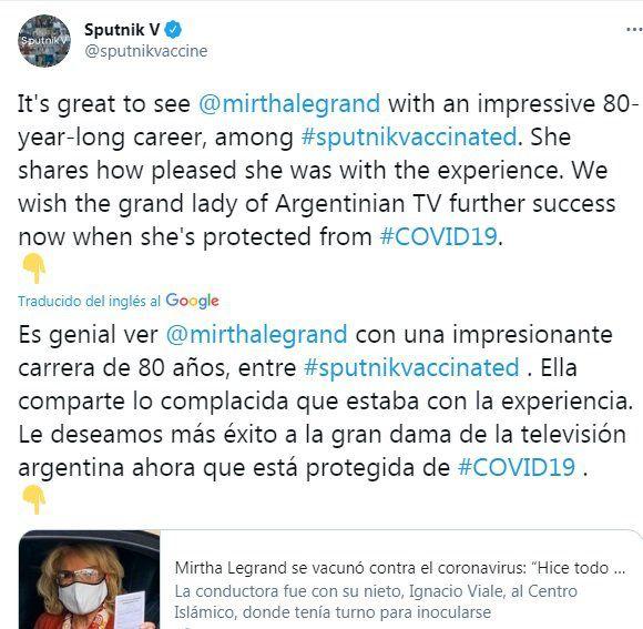"Es genial ver @mirthalegrand con una impresionante carrera de 80 años, entre los #sputnikvacunados", se señaló en la cuenta que informa sobre estudios, contratos y países que aplican la vacuna desarrollada por el Centro Gamaleya y el Fondo Ruso de Inversión Directa (RDIF, por sus siglas en inglés).