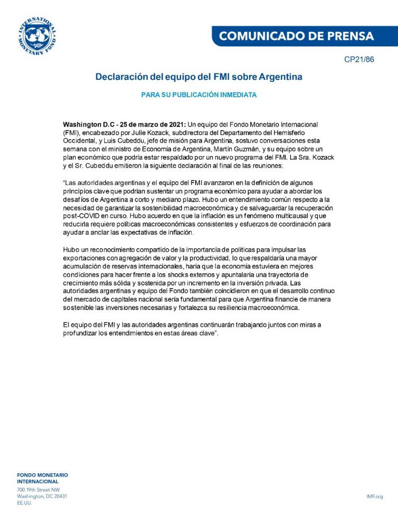 Concluyó expresando que "hemos estado trabajando de forma constructiva junto al equipo del FMI en construir entendimientos comunes sobre el funcionamiento de la economía argentina y los principios en los que es sano que se base la política macroeconómica. Y hemos logrado avances importantes."