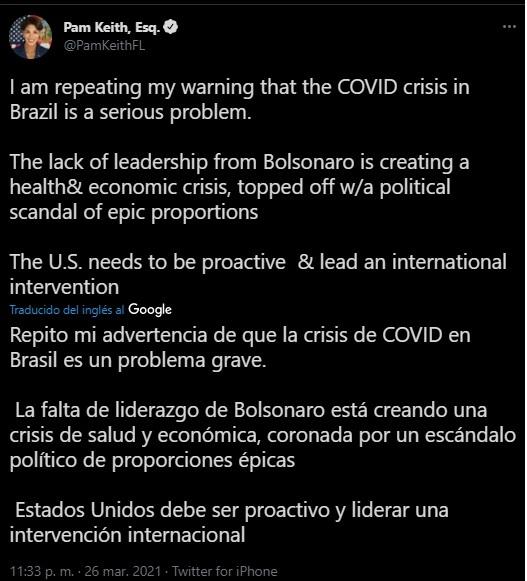 Con el aumento de las muertes por covid-19 en Brasil, superando los 3.000 registros diarios, y las alertas de la Organización Mundial de la Salud (OMS) sobre la crítica situación en el país, la demócrata Pam Keith utilizó Twitter el pasado sábado (27) para advertir sobre el crisis en el país, diciendo que Estados Unidos necesita liderar una intervención internacional. El demócrata, que intentó postularse para el Congreso desde el estado de Florida en las elecciones del año pasado, aún calificó al presidente Jair Bolsonaro de genocidio.