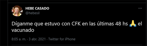 Después de que el mandatario confirmara su cuadro positivo de Covid-19 durante la madrugada del último sábado, la diputada provincial electa Hebe Casado publicó en su cuenta de Twitter: "Díganme que estuvo con Cristina Fernández de Kirchner en las últimas 48 horas el vacunado".