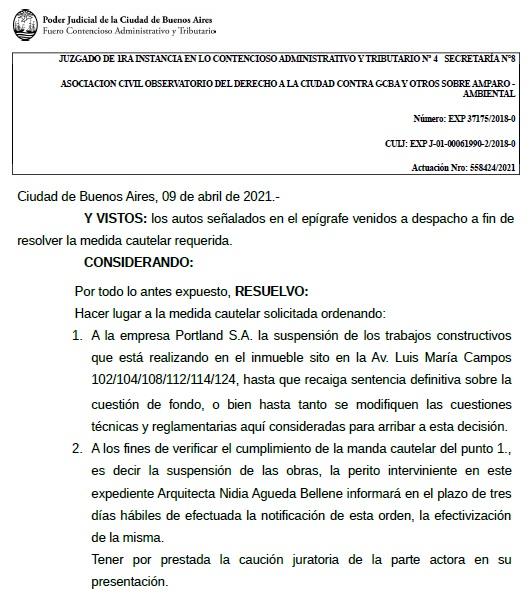 De esta manera informó Jonatan E Baldiviezo, Presidente del Observatorio del Derecho a la Ciudad, desde su cuenta de Twitter. "La Justicia de la Ciudad ordenó cautelarmente al GCBA y la empresa Portland S.A. la suspensión de los trabajos constructivos que está realizando en el inmueble sito en la Av. Luis María Campos 102/104/108/112/114/124."