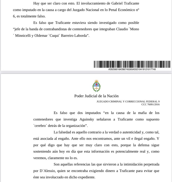 El periodista firmó una nota en la que se aludía al empresario como involucrado en esa causa judicial y con ello "había instalado social y mediáticamente que Traficante era investigado como jefe de la mafia de los contenedores" en 2016.