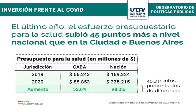 Si se compara la inversión en el ámbito de la salud que realizó el Gobierno Nacional con el que realizó la Ciudad Autónoma de Buenos Aires, se observa una gran diferencia entre ambas jurisdicciones. Mientras que el gobierno nacional incrementó su presupuesto en salud entre el 2019 y el 2020 en un 98%, la CABA lo aumentó solo en un 53%, apenas por encima de la inflación. Teniendo en cuenta que los 31 hospitales que dependen de la CABA solo aumentaron en promedio un 39% se concluye que hubo un ajuste en los hospitales de la CABA en un año de pandemia dado que aumentaron por debajo de la inflación