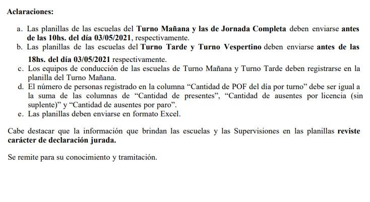 "Acuña determinó que "Las planillas de las escuelas del Turno Mañana y las de Jornada Completa deben enviarse antes de las 10hs. del día 03/05/2021, respectivamente (...) Las del Turno Tarde y Turno Vespertino deben enviarse antes de las18hs. del día 03/05/2021".