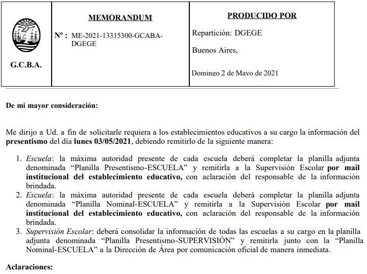También precisó que "en el último párrafo de las "aclaraciones", la cartera educativa porteña advierte: "Cabe destacar que la información que brindan las escuelas y las Supervisiones en las planillas reviste carácter de declaración jurada""