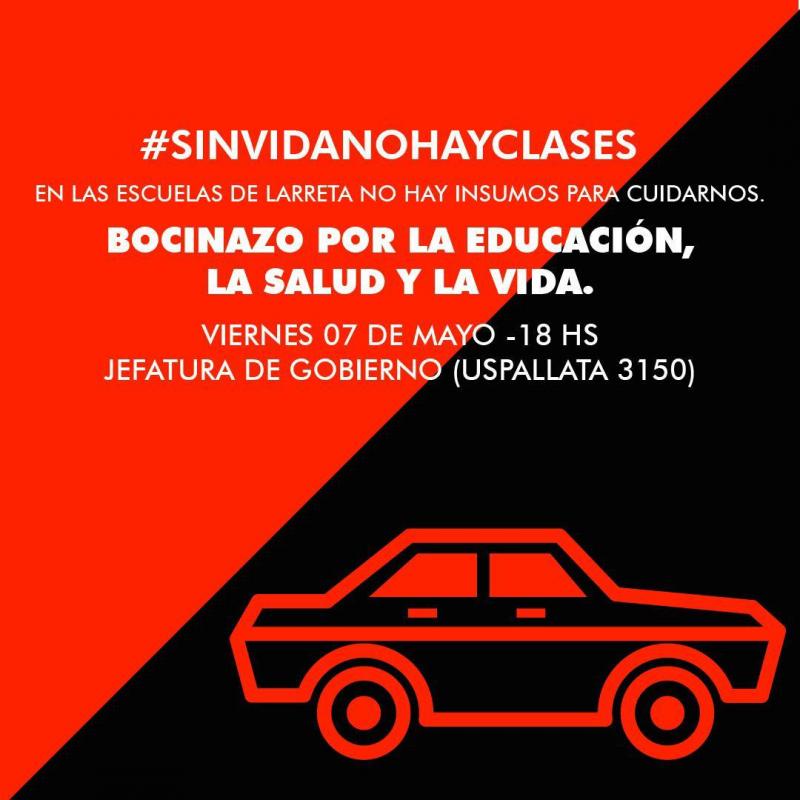El próximo viernes 7 de Mayo, a partir de las 18hs, familias de alumnas y alumnos porteños convocan a otro Bocinazo para reclamarle a Larreta, medidas para cuidar la educación, la salud y la vida de estudiantes y docentes.