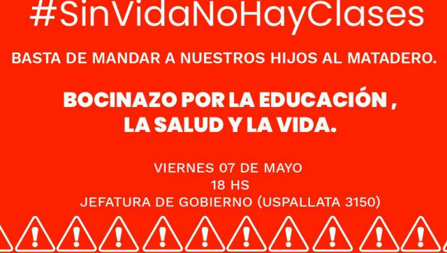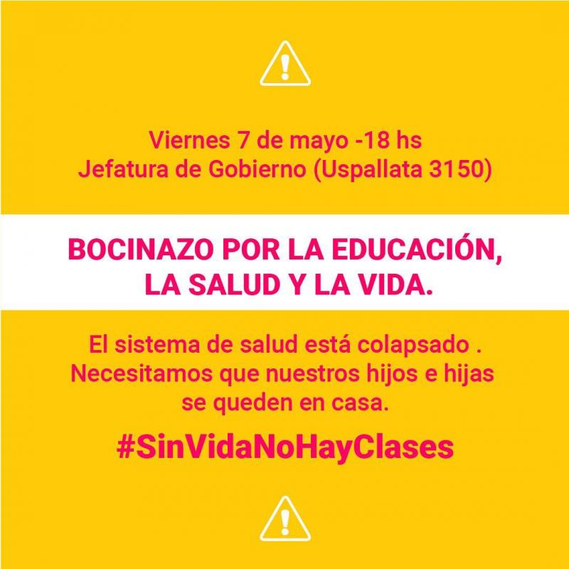 (Por Alejandra López Zavaleta) Este viernes 7 de mayo, a partir de las 18hs, familias con niños y niñas en edad escolar realizarán un “Bocinazo” frente a la Jefatura de Gobierno de la Ciudad para exigirle al Jefe de Gobierno Horacio Rodríguez Larreta, que tome las medidas necesarias para cuidar la educación, la salud y la vida.