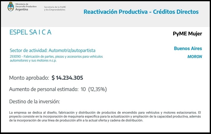 Según consta en los registros de la Secretaría de Pyme, la firma ESPEL SA I CA perteneciente al sector de actividad Automotriz/autopartista, que "se dedica al diseño, fabricación y distribución de productos de encendido para vehículos y motores estacionarios" recibió un crédito directo por $14.234.305 para incrementar el personal de la planta en un diez por ciento mediante la "incorporación de una línea de producción afín a la actual oferta y cadena de distribución".