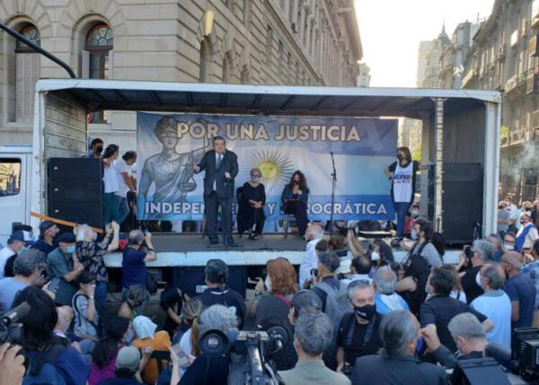 Desde el escenario montado en Plaza Lavalle, sobre la calle Talcahuano, Ramos Padilla advirtió: «acá está el pueblo» y dijo que «el pueblo se merece jueces en la casa de las leyes, en la casa de la justicia».