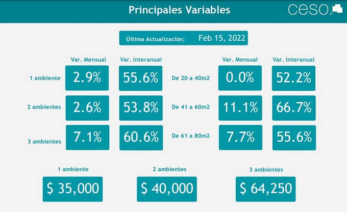 - Aumentos mensuales. Los aumentos con respecto a enero de 2022 fueron de 2,9% en los monoambientes, 2,6% para los de 2 ambientes y 7,1% en los de 3 ambientes.